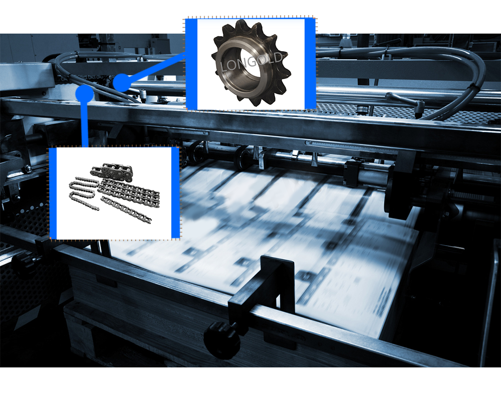 印刷設(shè)備通常需要較大的動(dòng)力來驅(qū)動(dòng)各個(gè)部件的運(yùn)動(dòng),隆德的傳動(dòng)鏈和鏈輪可以將動(dòng)力從電機(jī)等動(dòng)力源傳遞到印刷設(shè)備的各個(gè)部位,確保設(shè)備的正常運(yùn)行。圖中為滾子鏈和鏈輪組合來為印刷設(shè)備傳動(dòng)動(dòng)力。 |