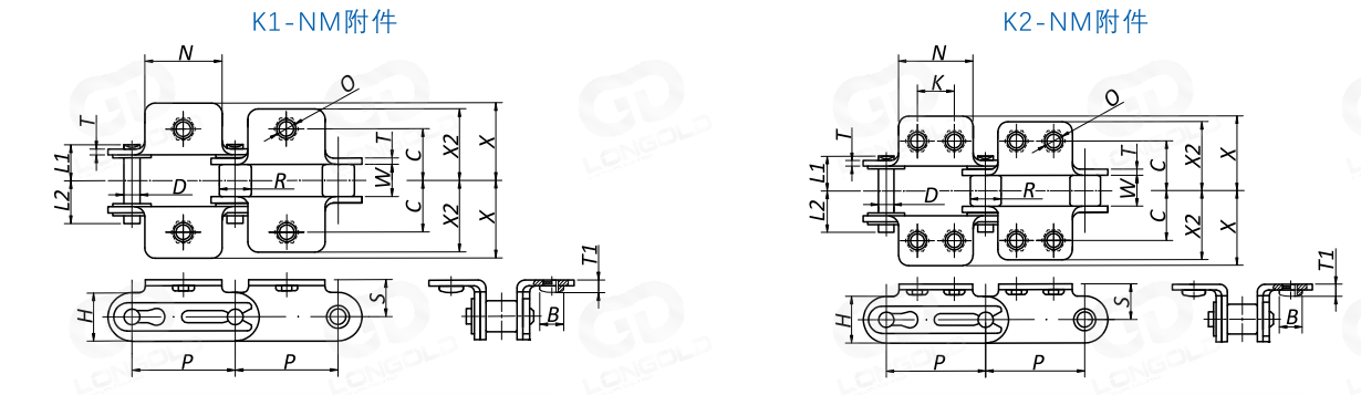 鏈條兩側(cè)帶有折彎板附件,附板上有1個或者2個螺孔,且附件上裝有螺母,附件表示為K1-NM,K2-NM。