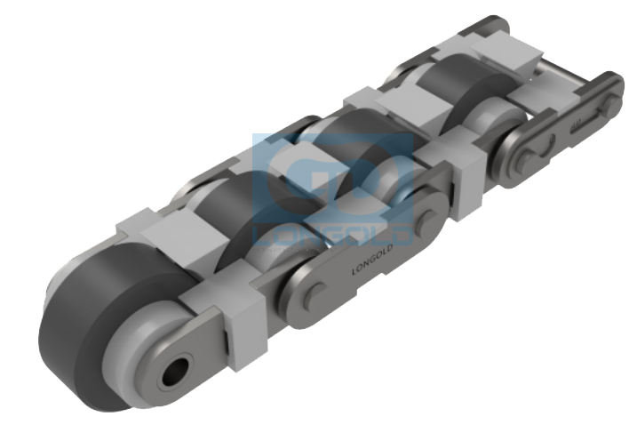 小口徑滾子和大口徑滾子組合的獨(dú)特構(gòu)造,可實(shí)現(xiàn)鏈條輸送物速度高于鏈條運(yùn)行速度,一般可以達(dá)到2.5 倍或者3倍。
