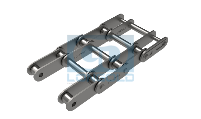 增加A系列滾子鏈條的銷軸的長度,將兩條鏈條并排設(shè)置。適用于在銷的上面放置物品進行輸送,通常在其上加裝鏈網(wǎng)使用。