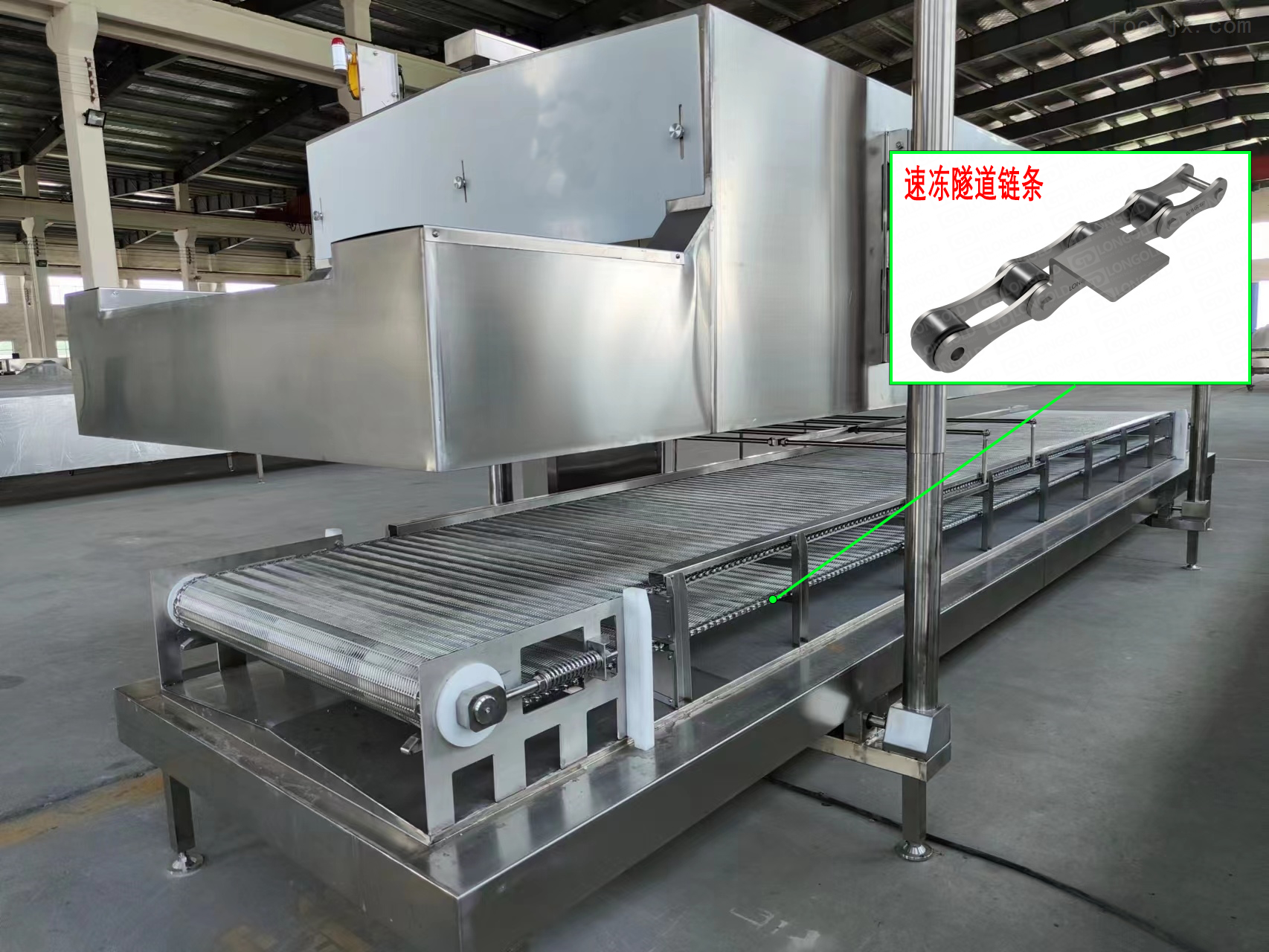對于部分食品,例如肉類食品,在常溫下非常容易變質(zhì),因此需要進(jìn)行一定的冷凍處理。在食品冷凍處理的步驟中,將所有食品運輸至冷藏庫進(jìn)行冷凍不失為一種辦法,但在工廠之中,這種方式所耗費的時間和成本較大,為保證速率,隧道式速凍機便應(yīng)運而生,通過搭配耐低溫的速凍隧道鏈條將食品運輸?shù)剿淼朗剿賰鰴C內(nèi),可以達(dá)到快速冷凍食品的效果。 |