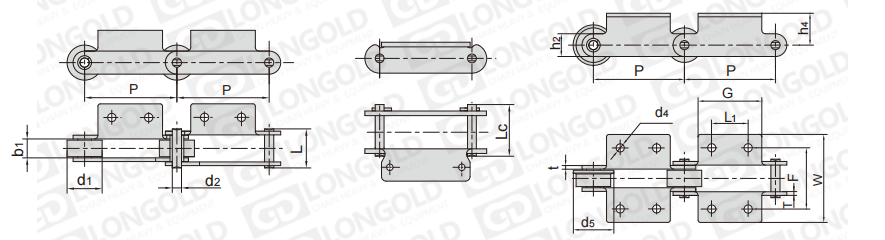 此種輸送鏈?zhǔn)怯呻p節(jié)距鏈條衍生而來的,鏈條節(jié)距為非常用規(guī)格,通過裝備標(biāo)準(zhǔn)附件或非標(biāo)附件使鏈條滿足特定的工作需求。