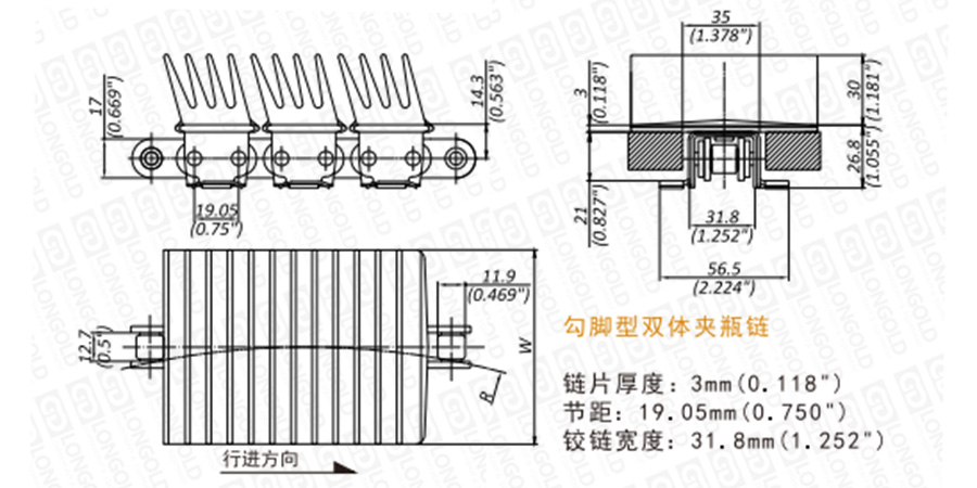 免加油自潤滑鏈條無需定期潤滑,多種規(guī)格的橡膠墊為每一種具體的應(yīng)用施加理想可控的作用力,由滾花的奧氏體不銹鋼銷軸構(gòu)成鏈片和夾爪的可靠系統(tǒng)。EV1874T系列鏈條為勾腳型雙體夾瓶鏈。鏈片為金屬材質(zhì),鏈片上帶有橡膠長齒,長齒結(jié)構(gòu)在發(fā)生彎曲變化時不會對產(chǎn)品和傳送線增加壓力,適合輸送空玻璃容器類產(chǎn)品。