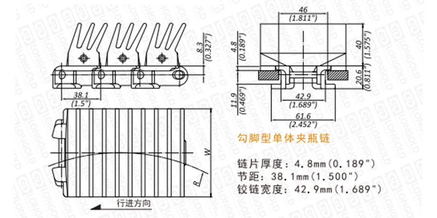 鏈片為塑料材質,鏈片上有長齒型橡膠,長齒結構在發(fā)生彎曲變化時不會對產品和傳送線增加壓力,特別適合于輸送空玻璃容器類產品。