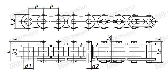 隆德SX高性能滾子鏈條的三項基本尺寸與B系列標準滾子鏈條相同。