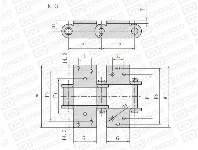 鏈條為套筒鏈,且?guī)3附件,即鏈條兩側(cè)的鏈板帶折彎板,折彎板上各帶三個孔。