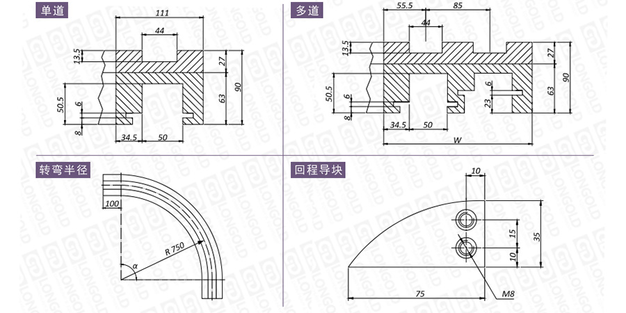 在選擇軌道時,需要考慮安裝尺寸、材質性質、轉彎角度等因素,如有需要,請咨詢隆德技術人員。