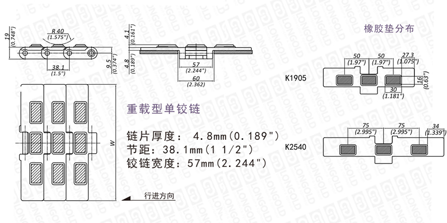 重載型單鉸鏈條。加強型鏈片厚度4.8毫米,重載鉸鏈寬57毫米。