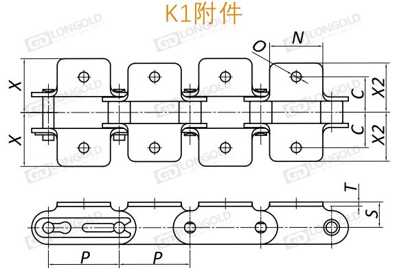上圖為S滾子鏈雙倍節(jié)距鏈帶附件圖,R滾子型的附件尺寸也與其相同。