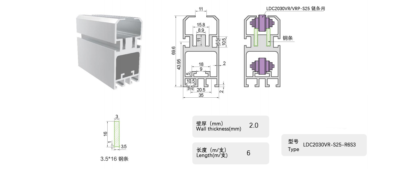 倍速鏈條用鋁制框架,用于滾子部采用工程塑料的倍速鏈條,包括帶蓋罩的倍速鏈條。在鋁制框架的輸送側(cè)小直徑滾子部安裝有鋼軌,可用于所有倍速鏈條。