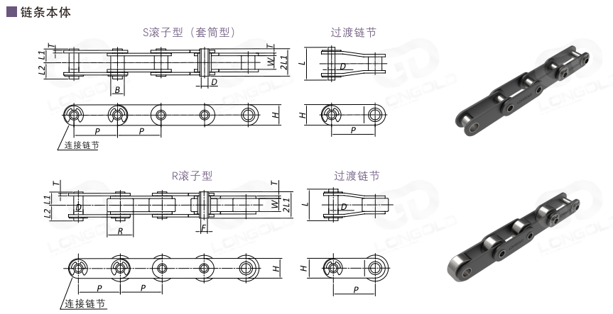 (2)鏈條本體的滾子類(lèi)型:R=R滾子,S=S滾子
