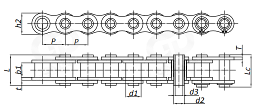 在非標(biāo)ISO606標(biāo)準(zhǔn)滾子鏈條的銷軸上開孔,利用該孔安裝各種附件的輸送用鏈條。不管鏈條是位于直線上,還是與鏈輪嚙合,附件中心距離都不會(huì)改變。