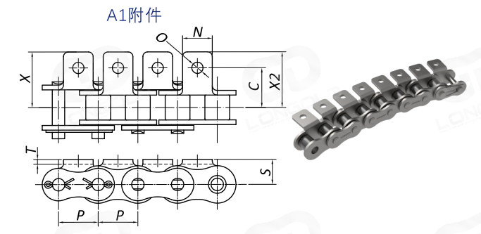帶附件側(cè)彎A系列鏈條請使用鋼制ANSI標準鏈輪。