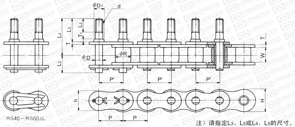 上圖為帶螺紋延長銷雙倍節(jié)距鏈結(jié)構(gòu)圖。