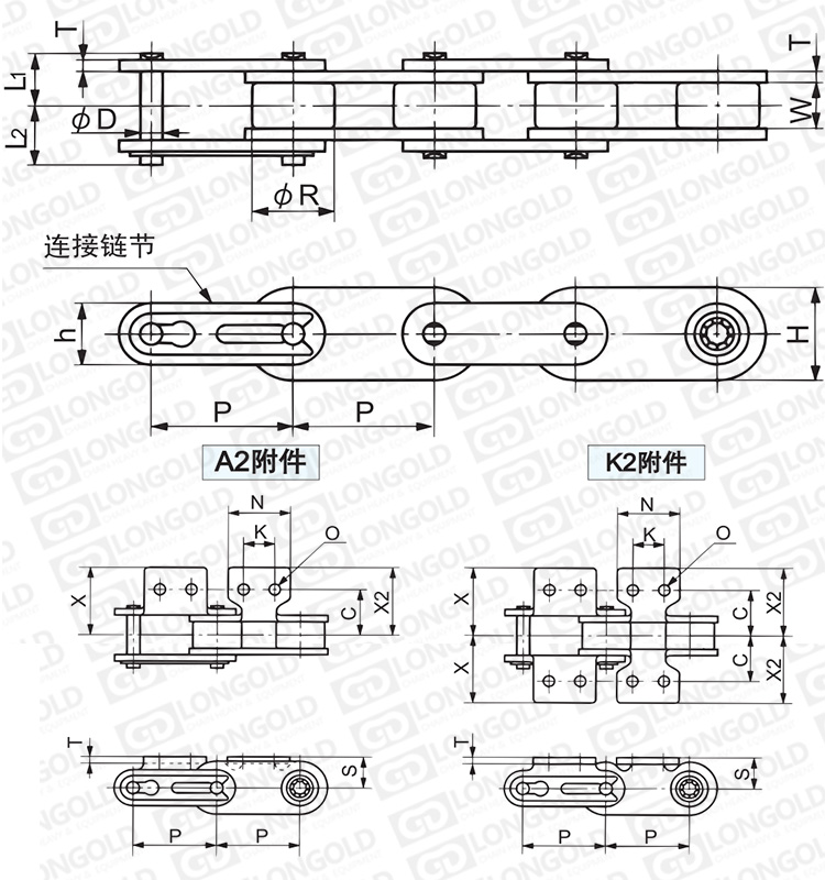 上圖為高精度的軸承套筒規(guī)格鏈條結(jié)構(gòu)圖以及帶附件結(jié)構(gòu)圖。