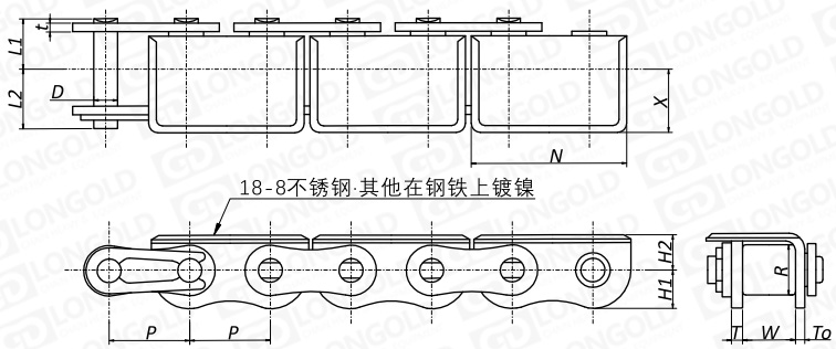 上圖為帶內(nèi)彎附件雙倍節(jié)距鏈S滾子帶附件圖。