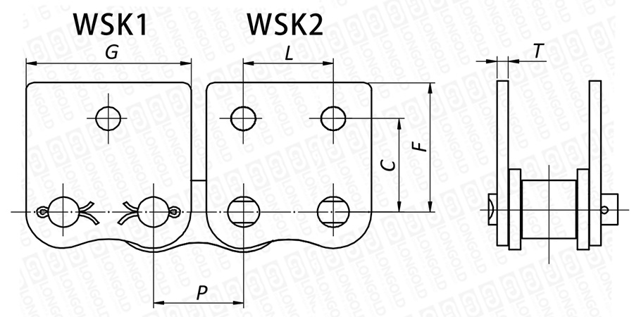 鏈條兩側(cè)帶有一定寬度的直立翼板附件,附板上有1個(gè)或者2個(gè)螺孔,附件表示為:WSK1和WSK2。