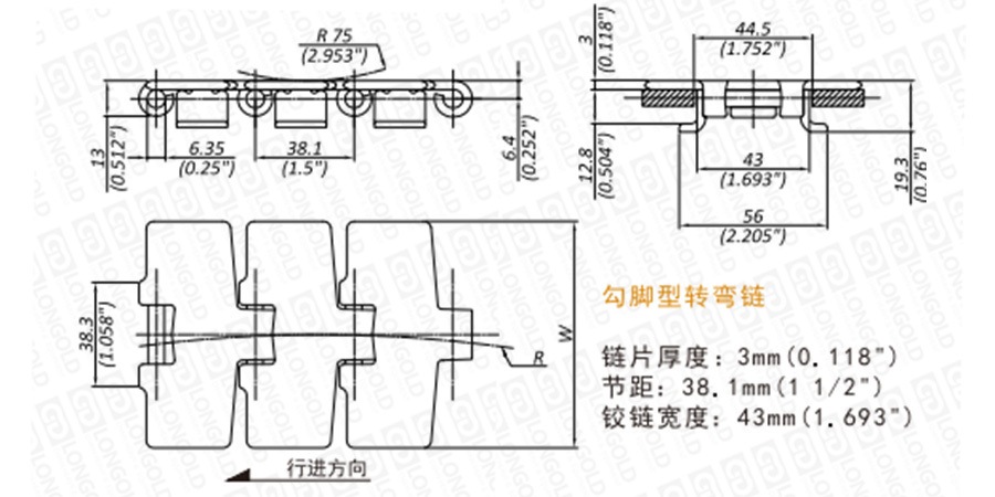 上圖為L(zhǎng)D881T系列側(cè)彎鏈的結(jié)構(gòu)圖,圖紙已標(biāo)明本體尺寸。