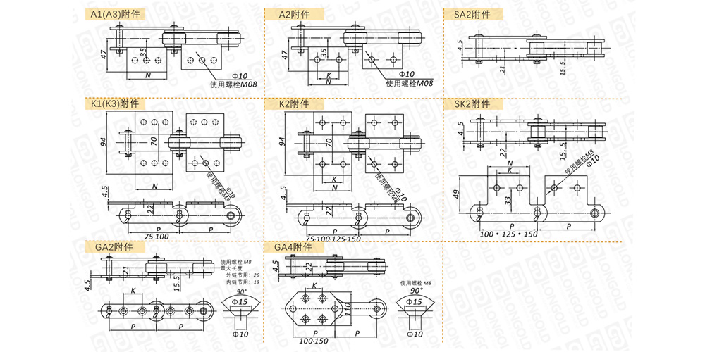 附件是為了將夾具安裝在鏈條上的零部件。可根據(jù)客戶要求設(shè)定安裝間隔。