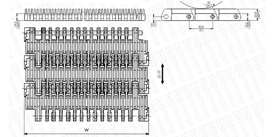 上圖為2"節(jié)距重載凸肋網(wǎng)帶 3110系列的結(jié)構(gòu)圖,圖紙中已標明部分尺寸。