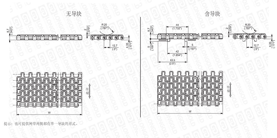 上圖為1/2"節(jié)距網(wǎng)帶與鏈板 HF510系列的結(jié)構(gòu)圖,圖紙中已標(biāo)明部分尺寸。