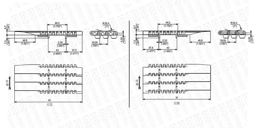 上圖為3/4"節(jié)距中載鏈板 7300G ATM系列的結(jié)構(gòu)圖,圖紙中已標(biāo)明部分尺寸。