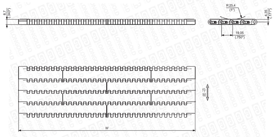 上圖為3/4"節(jié)距中載網(wǎng)帶與鏈板 7300系列,圖紙中已標明部分尺寸。