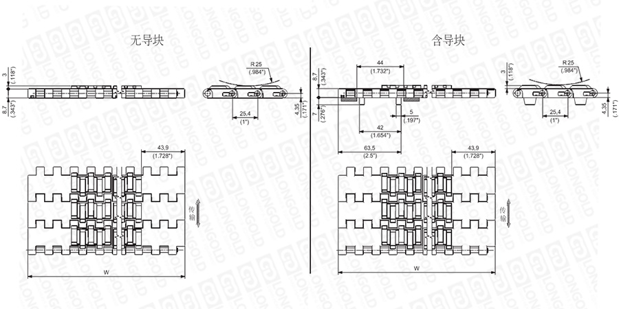 上圖為1"節(jié)距輕載網(wǎng)帶與鏈板 RR 1600系列的結(jié)構(gòu)圖,圖紙中已標(biāo)明部分尺寸。