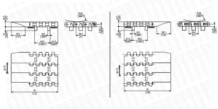 上圖為1"節(jié)距重載鏈板 USPG ATM系列的結構圖,圖紙中已標明部分尺寸。