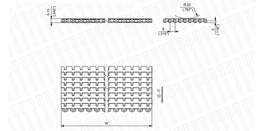 上圖為8mm超小節(jié)距網(wǎng)帶-8300系列的結(jié)構(gòu)圖,圖紙中已標(biāo)明部分尺寸。