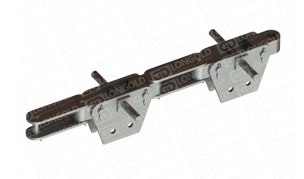 雙鉸接輸送鏈條設計用于能夠在空間范圍內(nèi)沿彎曲封閉軌道平穩(wěn)運行的輸送系統(tǒng),常見于輕型封閉軌懸掛輸送機。它的結(jié)構(gòu)允許在多個方向上靈活移動,適用于復雜的輸送路線。