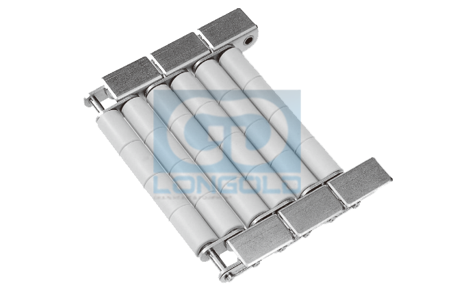 無托盤、可直接承載的自流式鏈條。塑料滾子安裝在鏈條的節(jié)線上,即使在彎曲時塑料滾子的間隔也保持不變。
