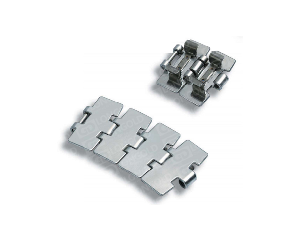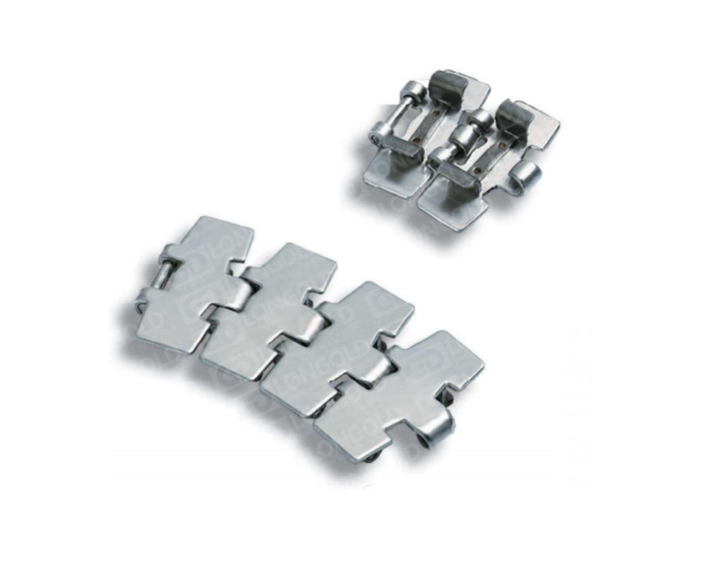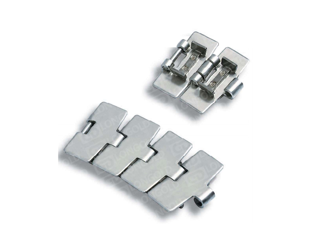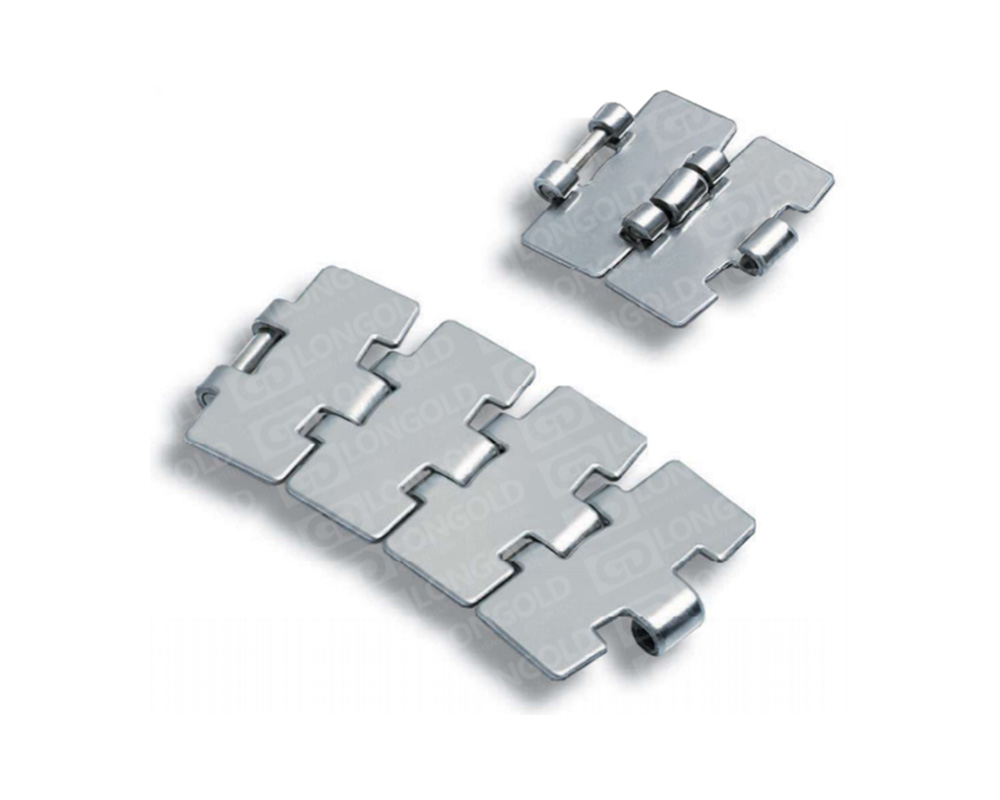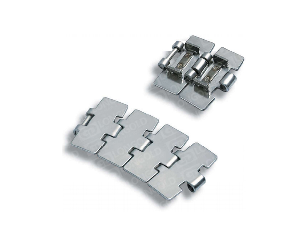 881T系列側(cè)彎鏈,鉸鏈為勾腳型(帶突舌),型號(hào)表示中用字母“T”表示。鏈片材質(zhì)為碳鋼時(shí),銷(xiāo)軸材料為表面硬化鋼;鏈片材質(zhì)為不銹鋼時(shí),銷(xiāo)軸材料為奧氏體不銹鋼。
