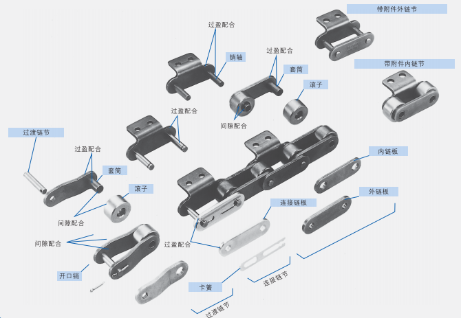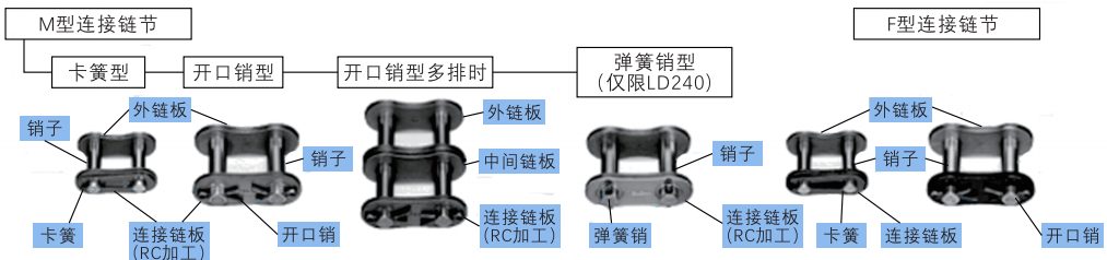 有三種類型的連接鏈節(jié):卡簧型、開口銷型和帶定位銷型。